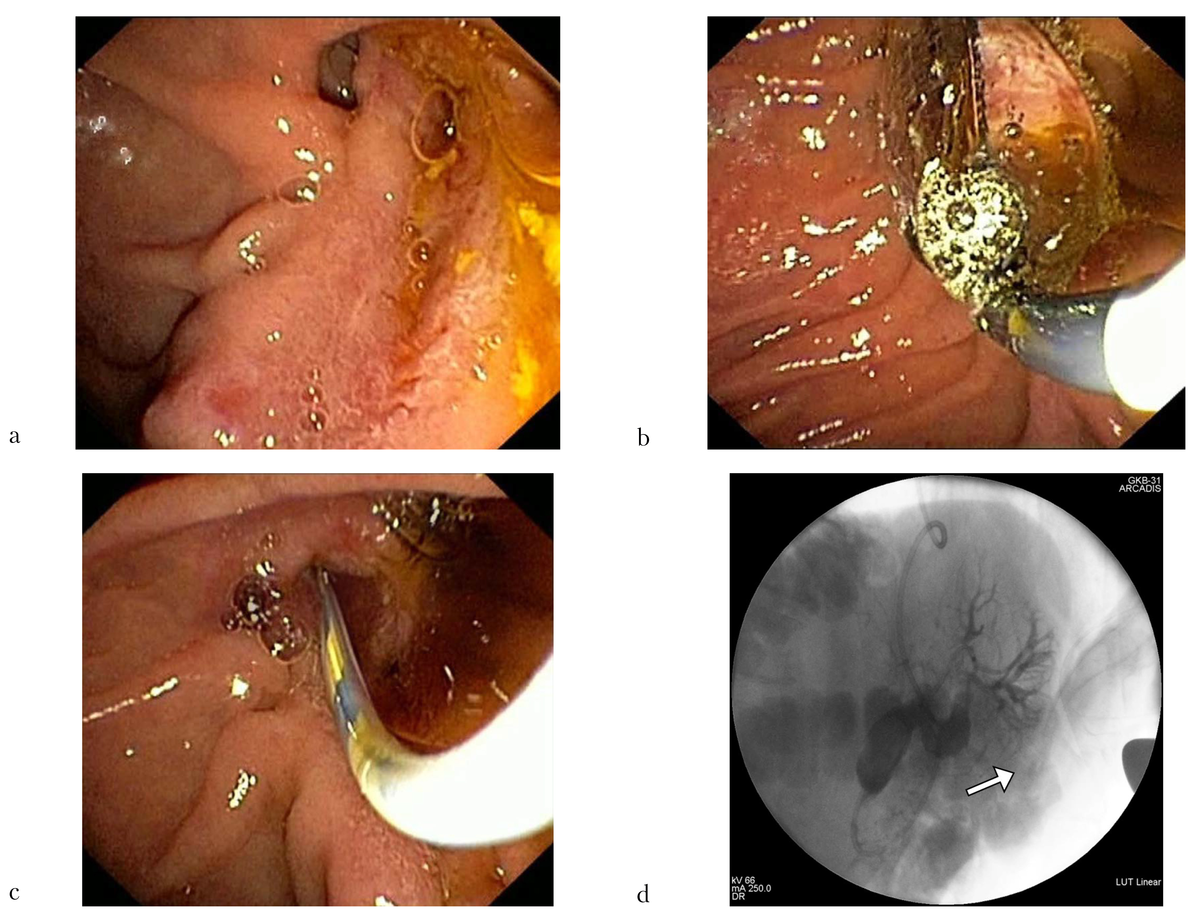 Рис. 2: a — устье холедоха до баллонной дилатации (эндофото); b — баллонная дилатация (эндофото); c — устье холедоха после баллонной дилатации (эндофото); d — назобилиарный дренаж, установленный в просвет ОЖП, где в дистальных отделах определяется крупный конкремент — указан стрелкой (холангиограмма)