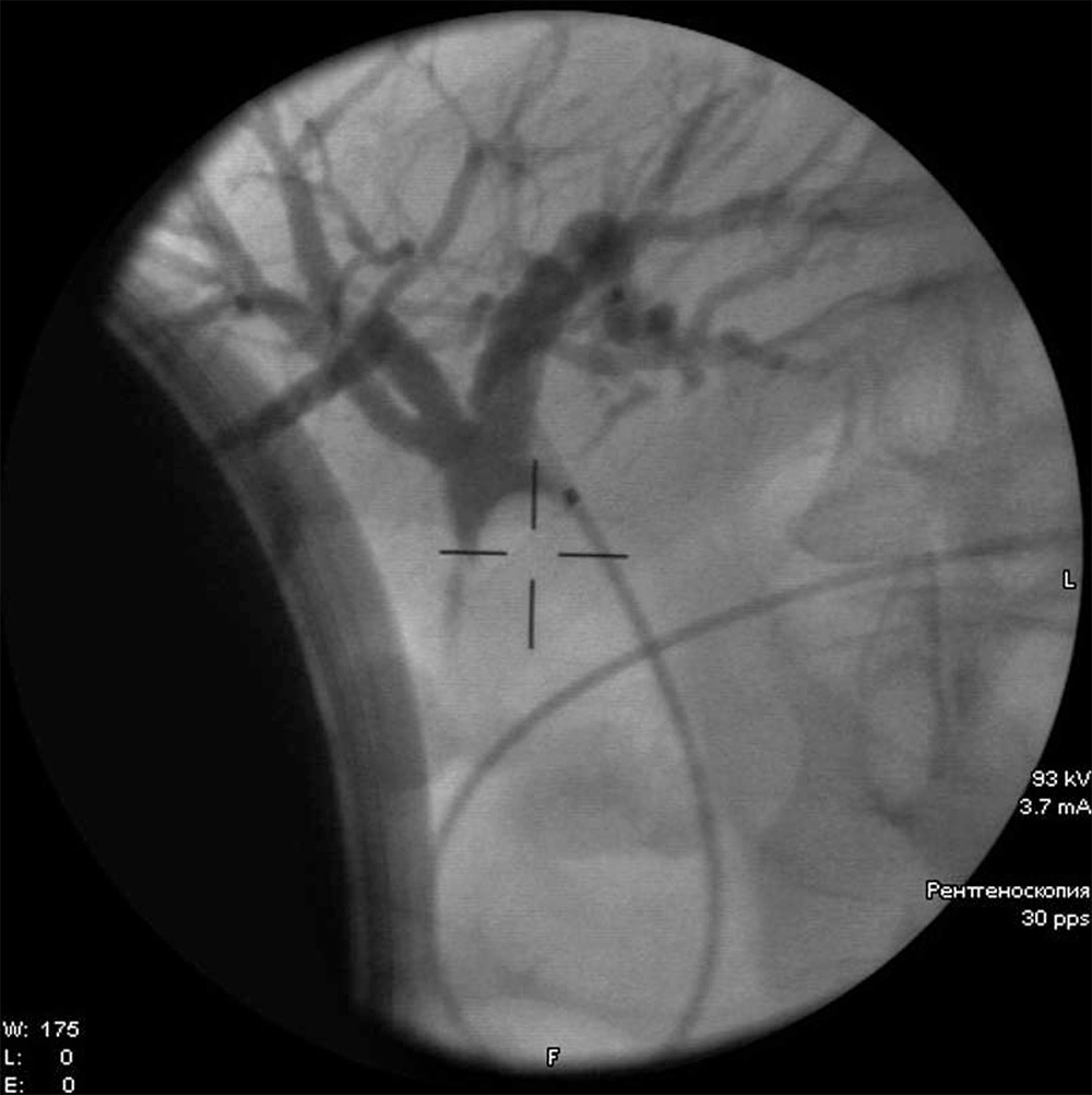 На 5-е сутки после первичного вмешательства и после констатации полного разрешения клинической картины холангита с применением аппарата Dornier Comact Delta II (Германия) был осуществлен один сеанс ДУВЛ, в ходе которого под рентген-навигацией на конкремент было осуществлено воздействие 3100 импульсов преимущественно максимальной интенсивности до 5 уровня (52,0 мПа, 0,72 мДж/кв. мм, 52,0 мДж, совокупная энергия 120,25 Дж). По завершении сеанса было отмечено лишь минимальное разрушение дистального края камня, заключавшееся в появлении некоторой нечеткости его контуров, и смещение конкремента в область общего печеночного протока при введении контрастного препарата (рис. 3).