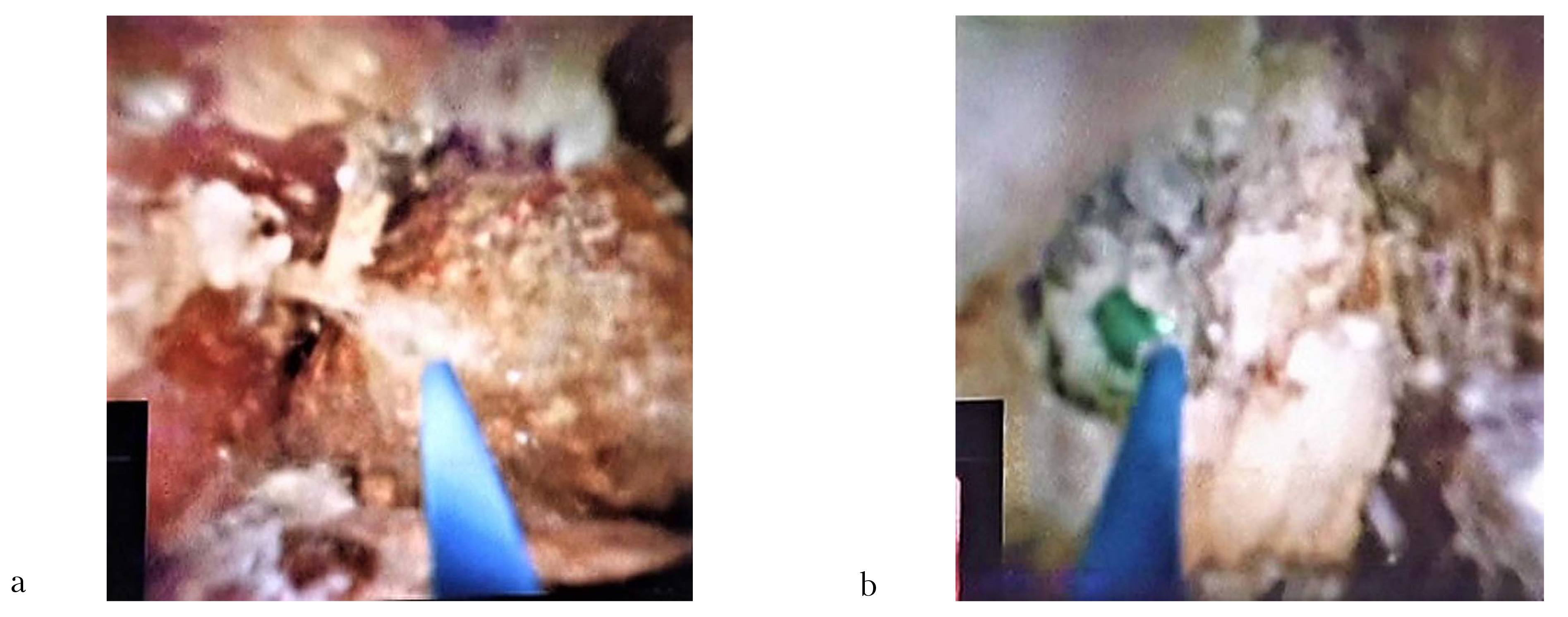 Рис. 4: a — разрушение нижнего полюса конкремента (эндофото); b — визуализирована центральная часть конкремента (эндофото)