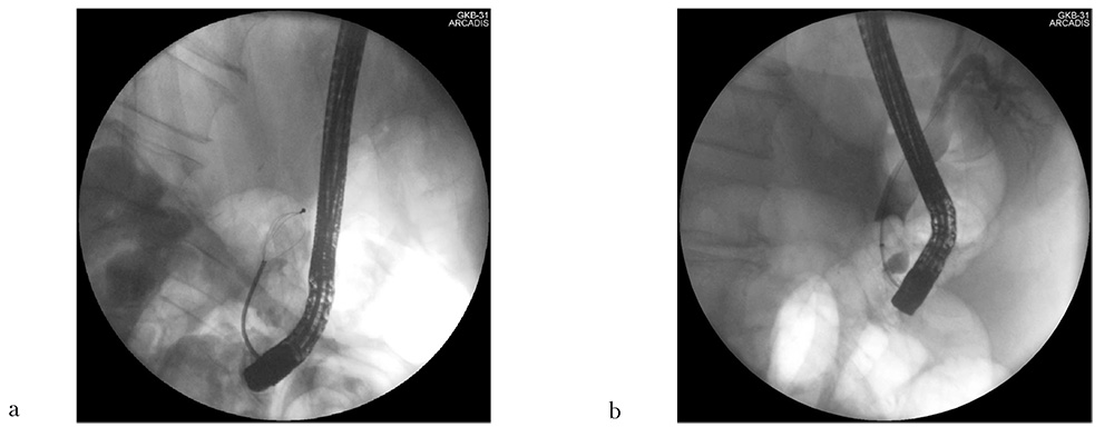 Рис. 6: a — механическая литотрипсия наиболее крупного фрагмента конкремента после лазерной литотрипсии (холангиограмма); b — контрольная ревизия экстракционным баллоном с выполнением обтурационной холангиографии (холангиограмма)