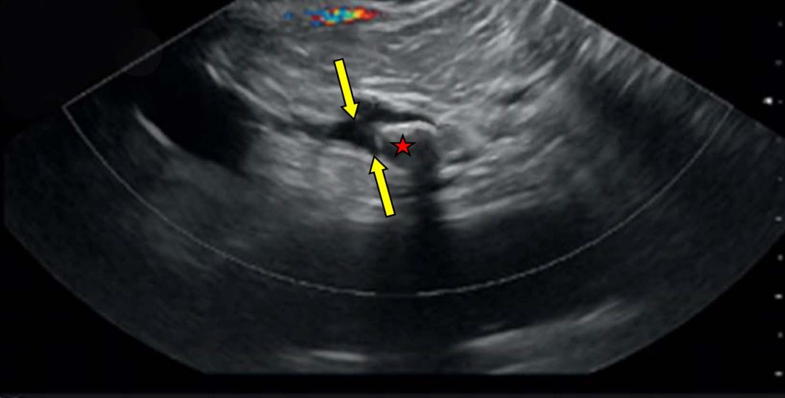 Рис. 7. Эндосонография поджелудочной железы конвексным эхоэндоскопом — в просвете расширенного вирсунгова протока (указан стрелками) крупный конкремент с яркой акустической тенью (отмечен звездочкой)