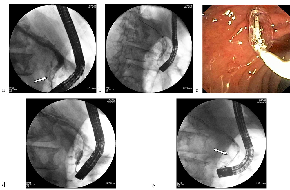 Рис. 8: a — выраженно расширенный ГПП с конкрементом в проекции головки ПЖ — конкремент указан стрелкой (панкреатикограмма); b — бужирование ГПП механическим дилататором (панкреатикограмма); c — баллонная дилатация устья и терминальных отделов ГПП (эндофото); d — баллонная дилатация стриктуры терминальных отделов ГПП (панкреатикограмма); e — попытка механической литотрипсии, при которой отмечена техническая невозможность захвата вирсунголита, конкремент — указан стрелкой (панкреатикограмма)
