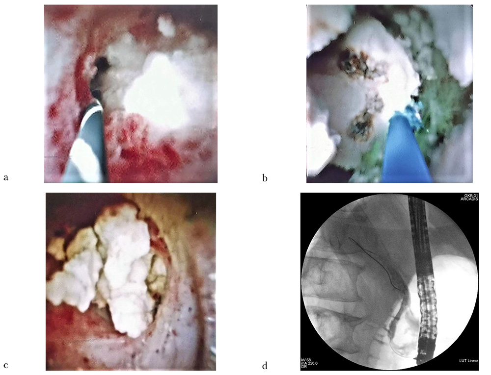 Рис. 9: a — вирсунголит, занимающий практически весь просвет ГПП (эндофото); b — разрушение «поверхностного» слоя вирсунголита (эндофото); c — фрагменты разрушенного «ядра» конкремента (эндофото); d — контрольное контрастирование ГПП (панкреатикограмма)