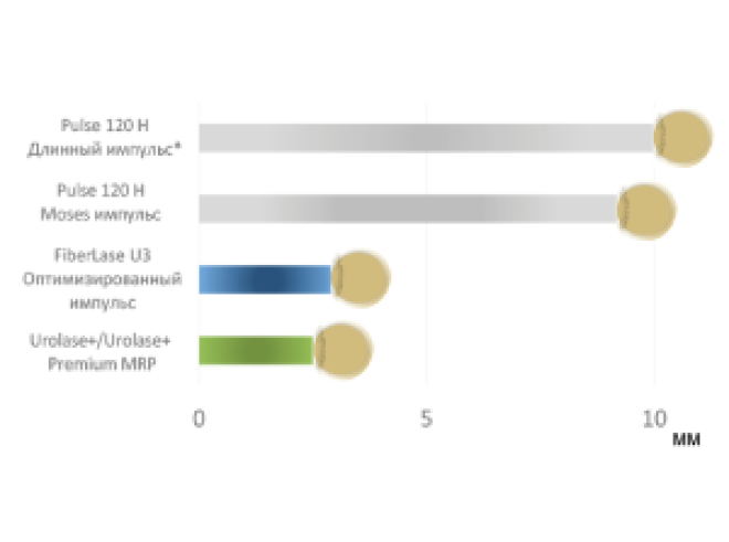 Модулированные импульсные настройки лазерных аппаратов Urolase+ и Urolase+ Premium позволяют проводить литотрипсию в различных режимах: от дробления «в пыль» до разрушения на крупные фрагменты для литоэкстракции и литоэвакуации.