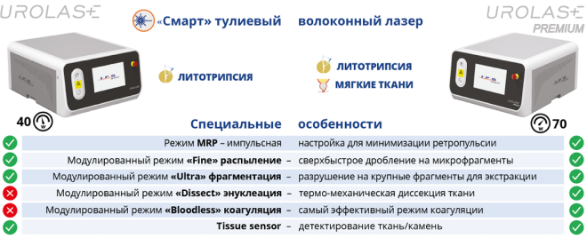 Лазерные аппафраты серии Urolase+ оснащенны уникальным датчиком детектирования ткани и специальными режимами работы для дробления камней всех локализаций (Urolase+) и , а также для дробления камней и операций на мягких тканях (Urolase+ premium).